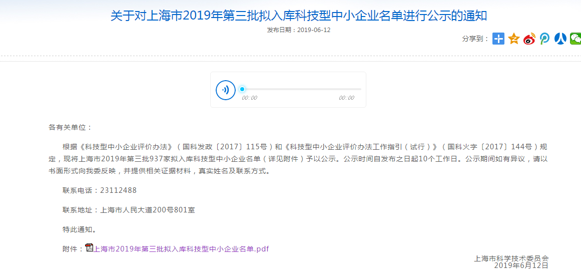 2019年6月26日,我司已過公示期正式入庫上海市科技型中小企業(yè)名單。根據(jù)科技部、財政部、國家稅務總局《科技型中小企業(yè)評價辦法》(國科發(fā)政〔2017〕115號)、科技部火炬中心《科技型中小企業(yè)評價辦法工作指引(試行)》(國科火字〔2017〕144號)要求,經(jīng)區(qū)評價機構審核及市科委的批準,我司成功入庫上海市2019年第三批科技型中小企業(yè)名單。