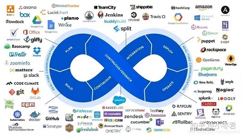 無論是縱向集成還是橫向集成,DevOps都需要通過工具鏈與持續(xù)集成、交付、反饋與優(yōu)化進(jìn)行端到端整合。如華為的軟件開發(fā)云服務(wù), 基于二十幾年的研發(fā)實踐,融合DevOps理念方法,為企業(yè)提供一站式的云上開發(fā)工具平臺。華為軟件開發(fā)云提供項目管理、配置管理、代碼檢查、編譯構(gòu)建、測試、部署、發(fā)布等端到端地覆蓋全軟件生命周期的相關(guān)服務(wù)。類似的DevOps 工具數(shù)不勝數(shù),常見的DevOps 生態(tài)圈工具如圖 5。