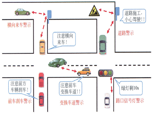 DSRC是基于美國電氣電子工程師協(xié)會(IEEE),在IEEE802.11 的Wi-Fi技術(shù)基礎(chǔ)上改進(jìn)制定的IEEE802.11p標(biāo)準(zhǔn)和IEEE1609標(biāo)準(zhǔn)的V2V和V2I通信協(xié)議,是比較成熟、高效的無線通信系統(tǒng)技術(shù),它是智能交通系統(tǒng)的重要基礎(chǔ)之一,目前已被歐洲、日本等國汽車制造企業(yè)采用并完善。我國在高速公不停車收費(fèi)設(shè)備(ETC)也采用該項(xiàng)技術(shù)。DSRC通信在5.9GHz附近的頻段上,專門將車與車、車與道路基礎(chǔ)設(shè)施有機(jī)連接,實(shí)現(xiàn)在數(shù)百米的范圍內(nèi)對高速行駛的車輛進(jìn)行識別和雙向通信,提供實(shí)時圖像、語音和數(shù)據(jù)信息傳輸,保證通信鏈路的低時延和低干擾以及系統(tǒng)的可靠性。例如DSRC在有效通信距離范圍內(nèi),本車輛通過DSRC以10Hz的頻率,向路上其他車輛發(fā)送位置、車速、方向等信息;同時本車輛還能收到其他車輛所發(fā)出的信號,在必要時(例如馬路轉(zhuǎn)角有車輛駛出,或前方車輛突然緊急剎車,變換車道的情況發(fā)生)車內(nèi)信號裝置會以閃爍、語音提醒或座椅、方向盤振動等方式提醒駕駛員注意,采取必要安全措施,如圖9所示。