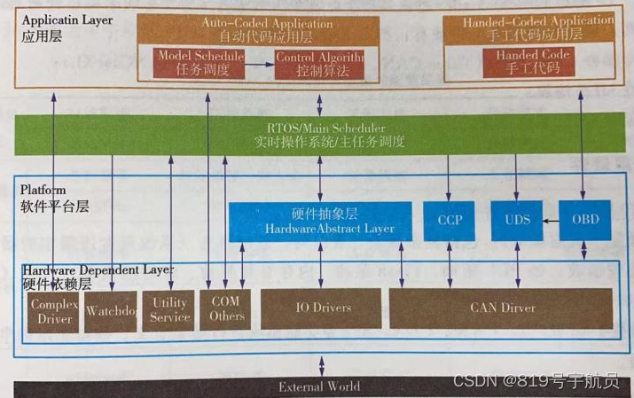 硬件依賴層(底層驅(qū)動):包括復(fù)雜驅(qū)動、看門狗、基礎(chǔ)服務(wù)(系統(tǒng)調(diào)度所需定時器、中斷管理和一些通用處理函數(shù),如PLL驅(qū)動、Flash驅(qū)動、內(nèi)存管理驅(qū)動、定時器驅(qū)動)、IO、CAN等其他驅(qū)動。