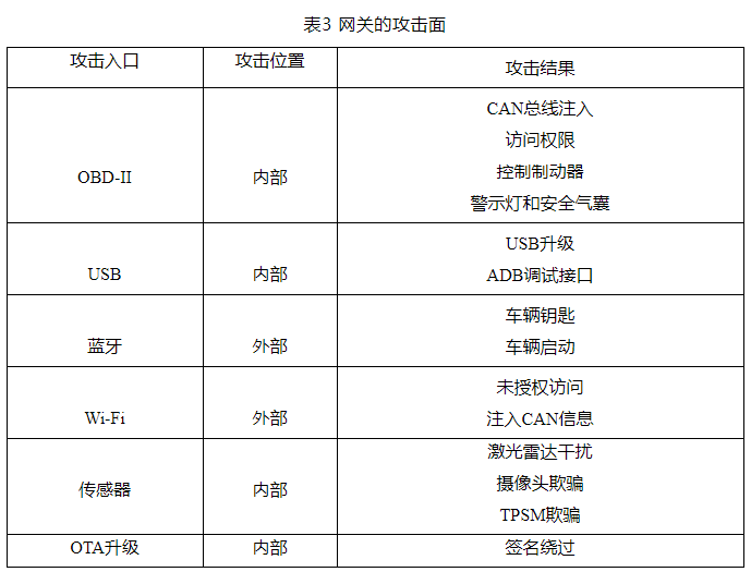 網(wǎng)關(guān)也是智能汽車最可能成為網(wǎng)絡(luò)攻擊的目標(biāo),網(wǎng)關(guān)一般是RTOS系統(tǒng),能夠弄清楚他的指令集是關(guān)鍵,網(wǎng)關(guān)的主要攻擊面(非詳盡),如表3所示。