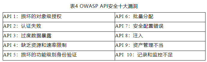 TSP是重要的車聯(lián)網(wǎng)云服務(wù),一般云服務(wù)存在的安全風(fēng)險,TSP同樣存在,可以參考OWASP Top 10。云端主要靠提供應(yīng)用程序編程接口(API)與其他端進(jìn)行通信,API位于應(yīng)用程序之間或者充當(dāng)處理系統(tǒng)之間數(shù)據(jù)傳輸?shù)闹虚g層,它提供了一個簡單而高效的接口,用于擴(kuò)展功能和改善聯(lián)網(wǎng)汽車體驗。API安全不是汽車網(wǎng)絡(luò)安全獨(dú)有的,更多API安全可以參考OWASP API安全十大漏洞,如表4所示。