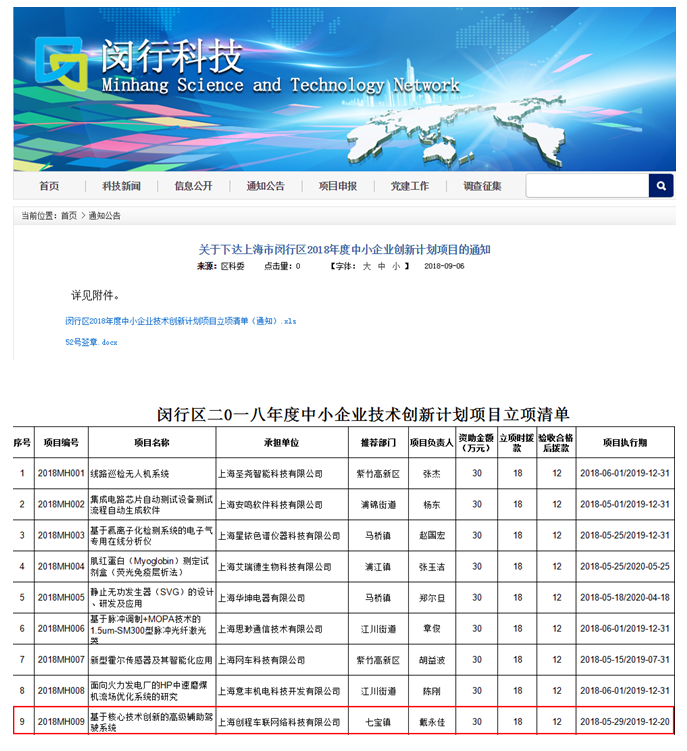 2018年9月6日,我司“基于核心技術創(chuàng)新的高級輔助駕駛系統(tǒng)”經(jīng)過上海市閔行區(qū)科委專家評審,獲得專家的一致好評,已于9月6日通過項目立項,項目立項后將獲得閔行科委資助資金30萬元。