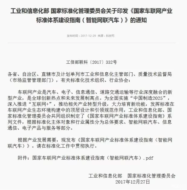 日前,工業(yè)和信息化部國家標準化管理委員向各省、自治區(qū)、直轄市及計劃單列市工業(yè)和信息化主管部門、質(zhì)量技術(shù)監(jiān)督局(市場監(jiān)管管理部門),有關(guān)標準化技術(shù)組織、行業(yè)協(xié)會下發(fā)了《國家車聯(lián)網(wǎng)產(chǎn)業(yè)標準體系建設(shè)指南(智能網(wǎng)聯(lián)汽車)》的通知。